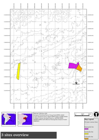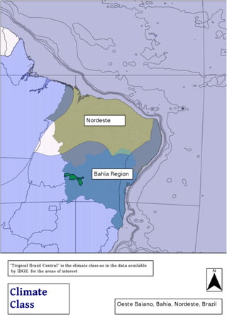 This document provides growth projections for eucalyptus plantations in Bahia, Brazil over a period of years based on climate and soil data. It describes two scenarios - one with average soil fertility and management, and another with increased irrigation, fertility, and optimized practices. The first scenario projects average growth rates similar to other studies in Brazil. The second scenario with improved practices projects significantly higher growth, with potential yields exceeding reports from other regions. Projections are based on a forest growth model run with climate data from a nearby weather station and soil properties.