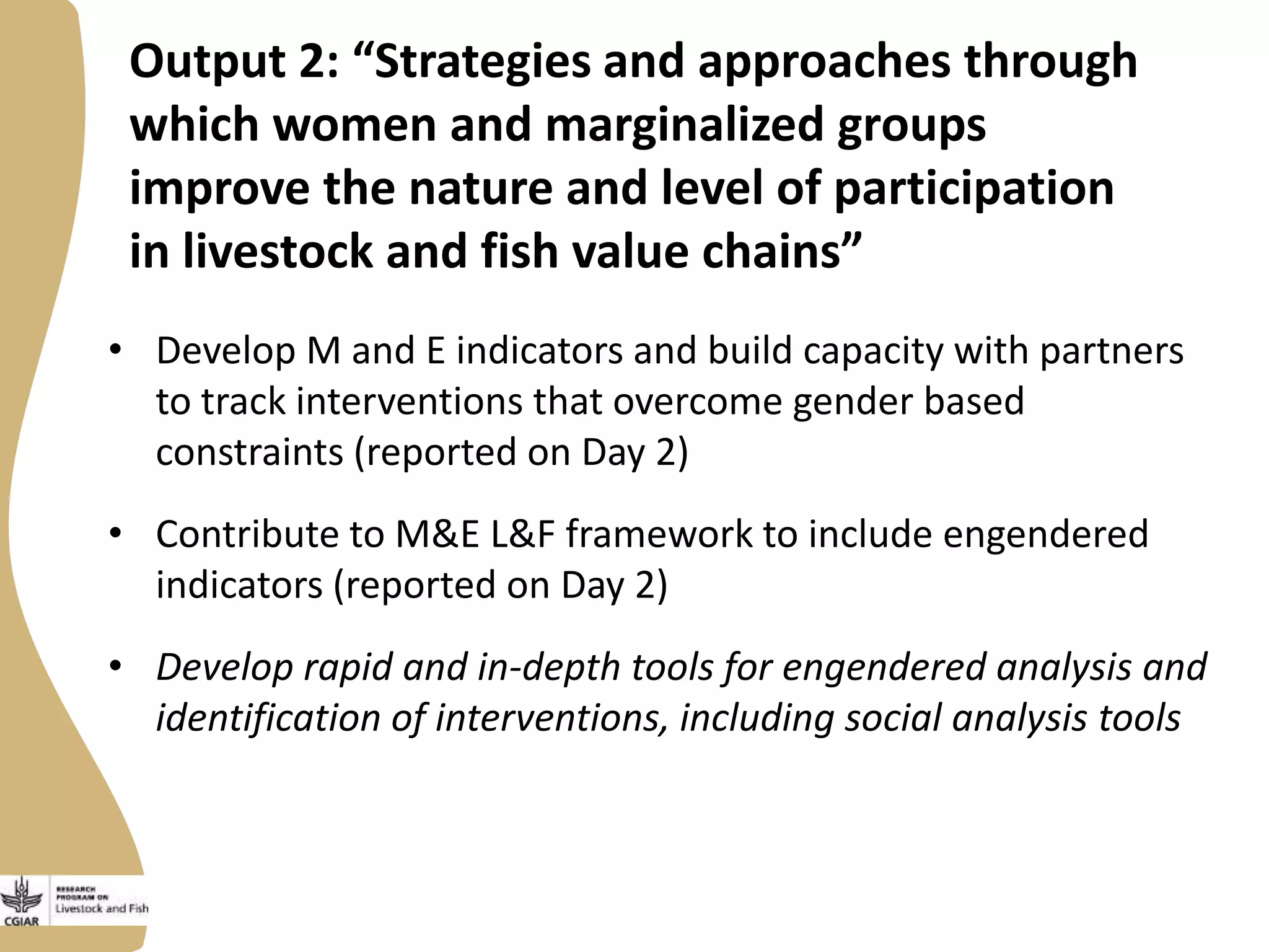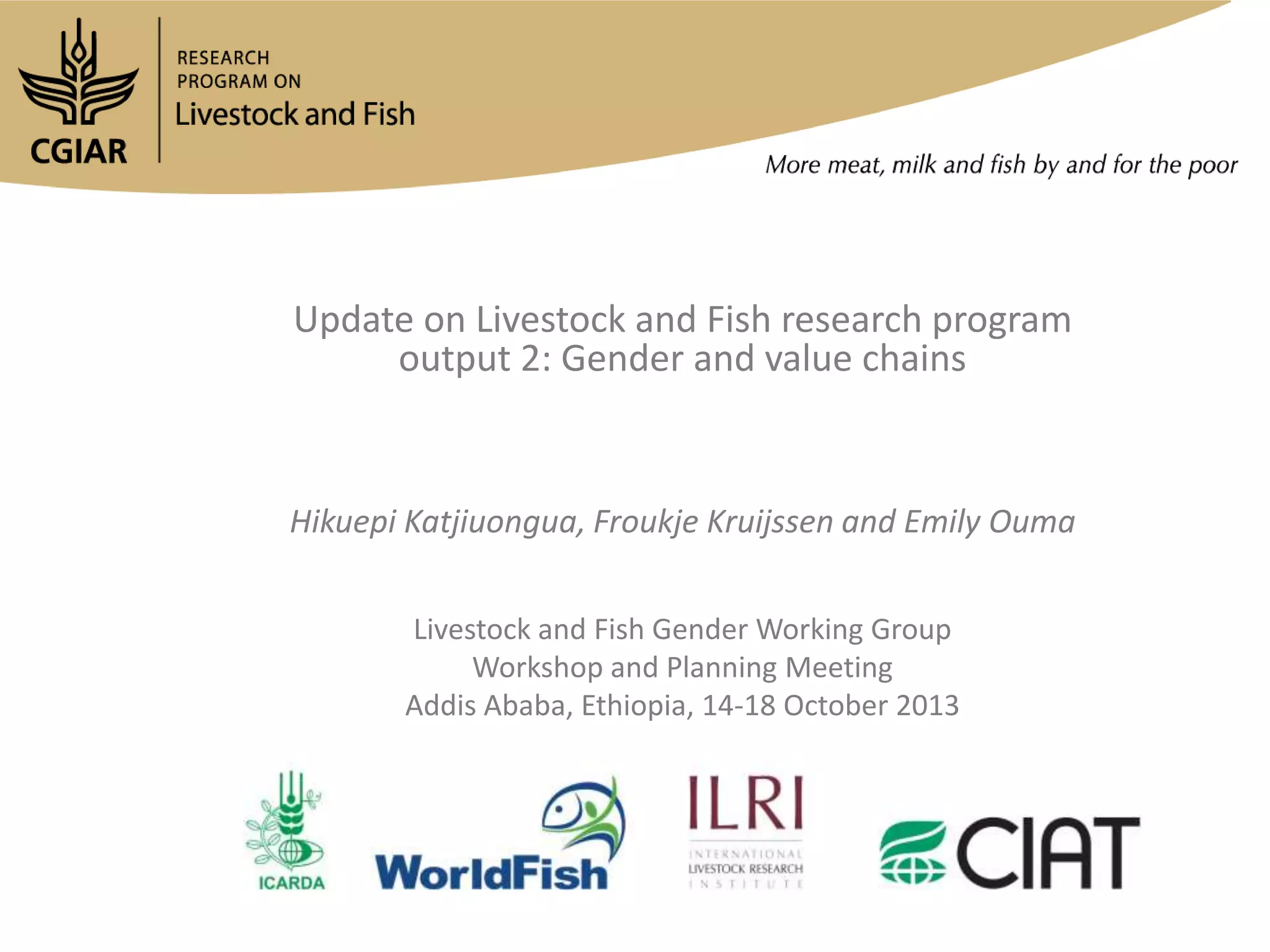 The document reports on strategies for enhancing women's and marginalized groups' participation in livestock and fish value chains, developed during a workshop in Addis Ababa in 2013. It discusses the creation of monitoring and evaluation tools, the application of the value chain analysis toolkit across various regions, and key lessons learned concerning gender inclusivity in the value chains. The document also outlines challenges in relation to gender indicators and improving communication among the livestock and fish programs.