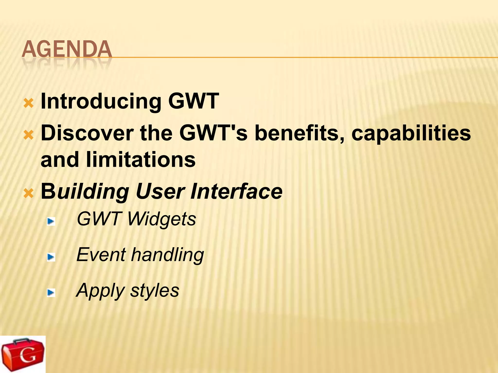 This document provides an overview and agenda for a presentation on Google Web Toolkit (GWT). It introduces GWT as a Java framework for building AJAX applications that compiles to JavaScript. The agenda covers building user interfaces with GWT widgets, handling events, and applying styles. It also discusses client-side RPC, creating and deploying GWT apps, history management, internationalization, JUnit testing, and the Javascript Native Interface. Later sections cover GWT best practices, security, performance, caching, design considerations, and common issues.
