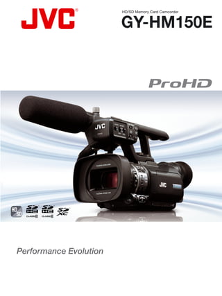 The document provides specifications for the GY-HM150E HD/SD memory card camcorder from JVC. It has the following key features: