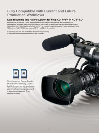 The document summarizes the GY-HM750E dual memory card camcorder. It records in HD and SD formats, with dual SDHC memory card slots allowing simultaneous or relay recording. It supports native QuickTime MOV recording for Final Cut Pro workflows and MP4 recording compatible with other NLEs like Premiere Pro. Key features include a 14x HD lens, 1080p recording at up to 35Mbps, and uncompressed audio. Dual format and native file recording provide flexibility for multi-format productions.