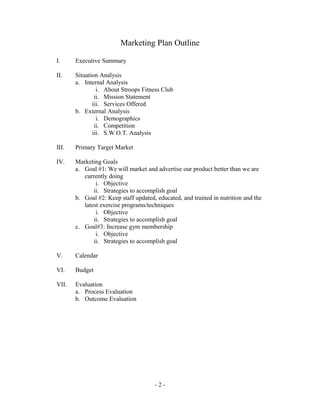 Stroops Fitness Club is a small gym located in Clearfield, Utah that manufactures its own unique exercise equipment. Its target market is adults aged 20-30 from middle-income families with children. Stroops aims to provide affordable fitness opportunities. However, it faces high competition from 19 other nearby gyms, especially Gold's Gym and new gym Performax. A SWOT analysis found Stroops' strengths are affordable prices and personalized service, but weaknesses include an unknown location and limited advertising. The marketing plan aims to better promote Stroops to increase membership 20% through expanded advertising, updated staff training, and bundled membership/training packages.