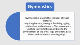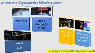 This document provides information about different types of gymnastics, including artistic gymnastics, rhythmic gymnastics, trampoline gymnastics, acrobatic gymnastics, and aerobic gymnastics. It outlines the men's and women's events in artistic gymnastics and describes the apparatuses and routines involved in rhythmic gymnastics. Trampoline gymnastics involves acrobatic skills performed on a trampoline, while acrobatic gymnastics features partnerships performing figures set to music. Aerobic gymnastics routines emphasize strength, flexibility, and aerobic fitness over acrobatic skills.