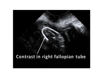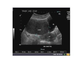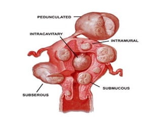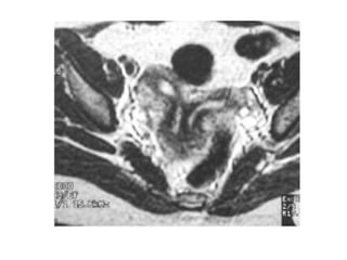 The document provides an overview of the normal radiological anatomy of the female pelvic organs including the uterus, endometrium, myometrium, cervix, vagina, ovaries and their appearance on ultrasound and MRI. It then discusses common uterine abnormalities such as congenital uterine anomalies, fibroids, adenomyosis and their imaging features. In adenomyosis, endometrial glands are present within the myometrium which can appear heterogeneous on ultrasound and cause diffuse or focal thickening of the junctional zone on MRI. Uterine fibroids appear as well-defined hypoechoic masses on ultrasound and may cause various signal changes on MRI depending on factors like degeneration. Congenital anomalies result from