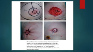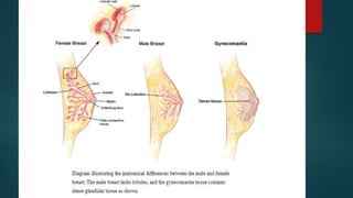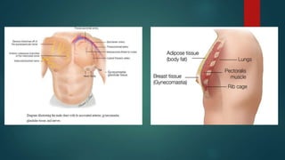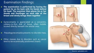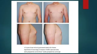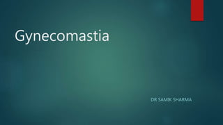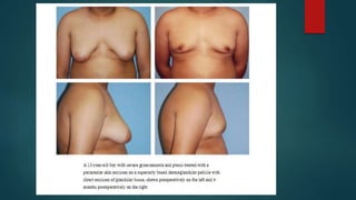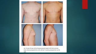 Gynecomastia refers to the benign enlargement of male breast tissue. It is a common condition, affecting up to 65% of adolescent boys. Causes include physiological changes during puberty or aging, as well as certain medications, medical conditions, or genetic factors. Diagnosis involves physical exam and sometimes lab tests or imaging to rule out other conditions. Treatment depends on severity but may include observation, medications to promote tissue regression, liposuction, or surgical excision of breast tissue. Surgical techniques aim to remove excess tissue while limiting scarring.