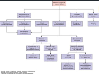 Gynecomastia is the benign enlargement of breast tissue in males caused by a hormonal imbalance with increased estrogen or decreased androgen levels. It can occur physiologically during puberty, aging or due to certain drugs. Evaluation involves history, exam and blood tests to check hormone levels and rule out underlying causes. Treatment depends on the severity and cause, with medical management using tamoxifen or surgery to remove breast tissue for longstanding or severe cases. Complications of surgery can include nipple or skin issues.