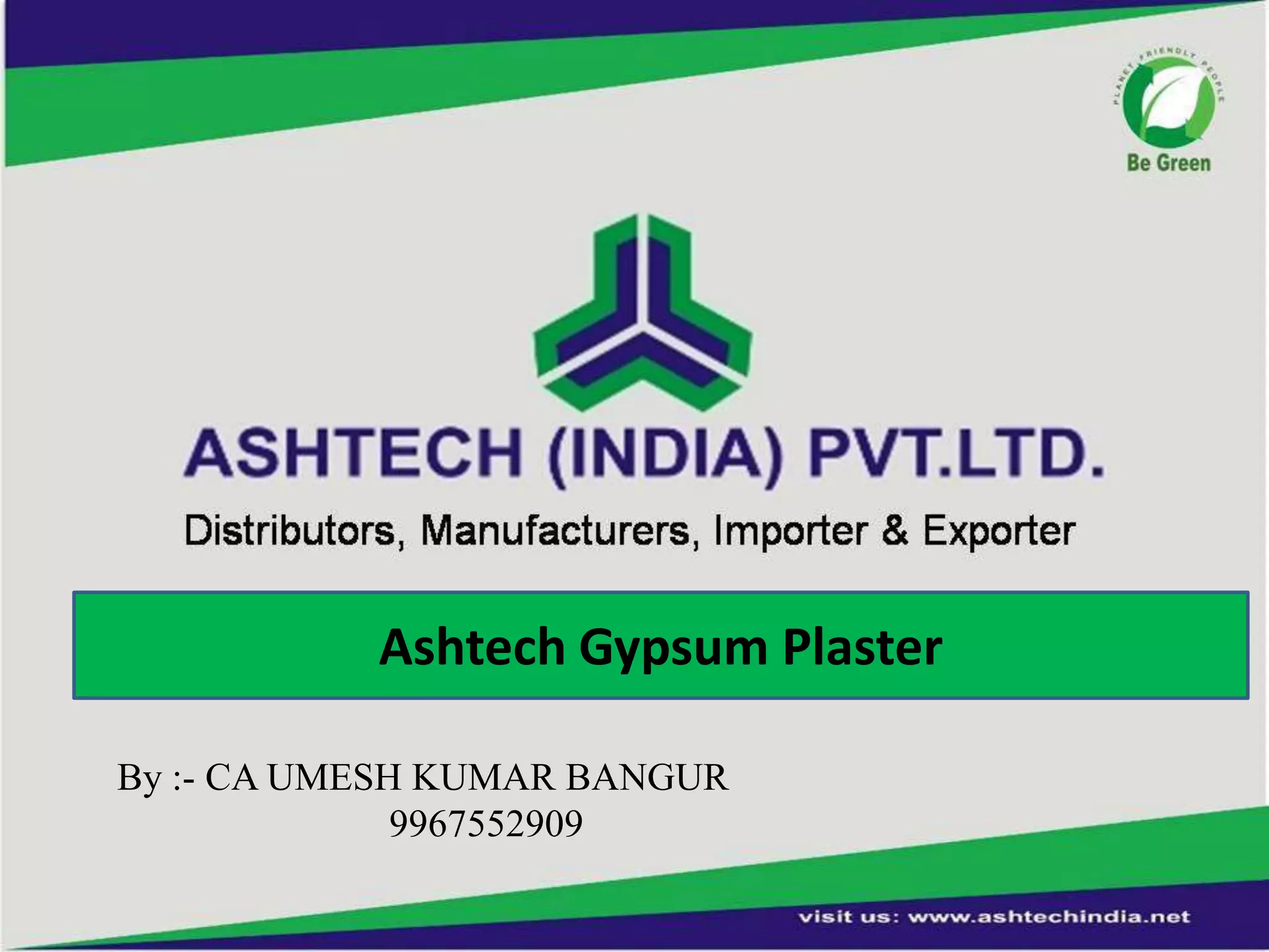 3. Ashtech produces high quality gypsum plaster in India under the brands Vega and Reva. Their plasters provide benefits over traditional plasters like sand cement in strength, application ease, and time savings.