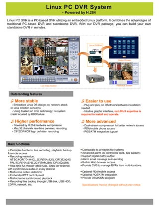 The document details various H.264 PC-based DVR solutions with key features including hardware compression that improves image quality and reduces storage requirements. It highlights multiple models capable of supporting a range of channels for real-time video recording, playback, and remote access functionality. Additionally, it describes the systems' compatibility with both Linux and Windows operating systems while emphasizing their advanced capabilities like dual-stream compression and mobile access.