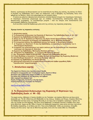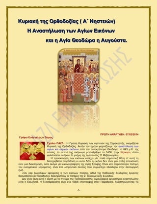 Σχόλιο ΠΑΖΛ : Η Πρώτη Κυριακή των νηστειών της Σαρακοστής, ονομάζεται Κυριακή της Ορθοδοξίας. Αυτήν την ημέρα γιορτάζουμε την αναστύλωση των αγίων και σεμνών εικόνων από την αυτοκράτειρα Θεοδώρα το 843 μ.Χ. της οποίας το σεπτό της σκήνωμα μεταφέρθηκε το 1456 στην Κέρκυρα, όπου φυλάσσεται ακέραιο. Η μνήμη της τιμάται στις 11 Φεβρουαρίου.