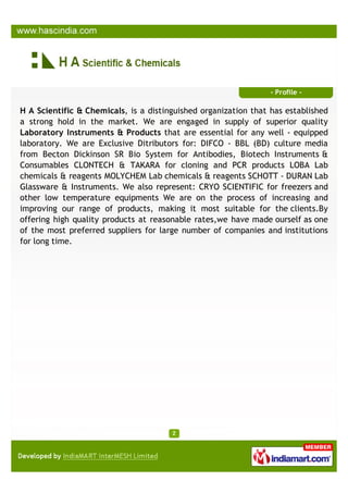 H A Scientific & Chemicals is a supplier and distributor based in Ahmedabad, established in 1980, specializing in a wide range of laboratory products, including glassware, plasticware, chemicals, and laboratory instruments. The firm serves as an exclusive distributor for various renowned brands and has earned a reputation for providing high-quality products at competitive prices. The company focuses on meeting client needs and expanding its product offerings while maintaining quality standards.