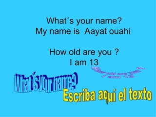 This document is a conversation where a person introduces themselves. They state their name is Aayat ouahi and that they are 13 years old. When asked where they are from, they respond that they are from Morocco. They also share that their favorite color is red and favorite sport is football.
