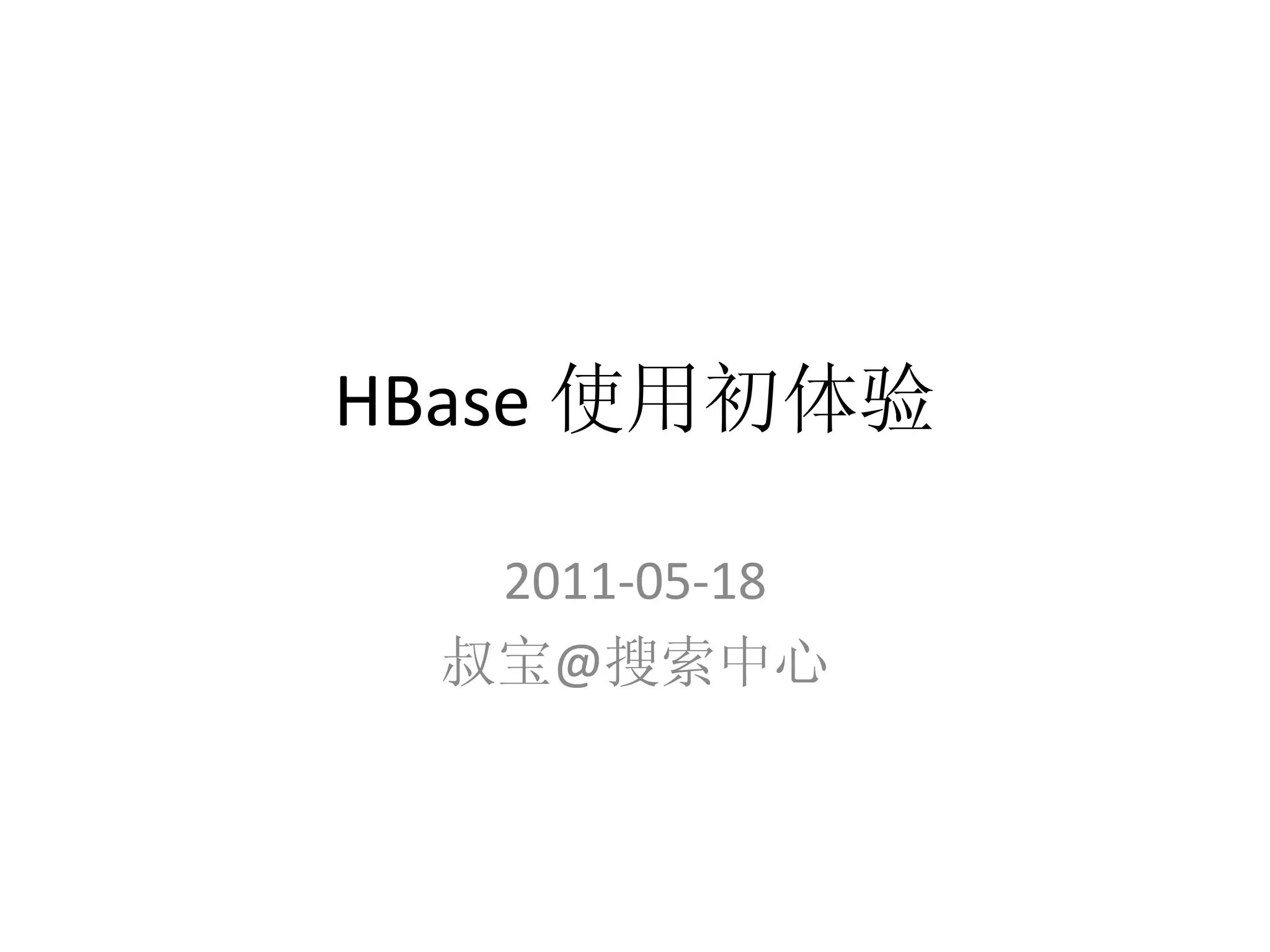 该文档介绍了HBase的基本概念及其架构,强调了HBase在处理大量数据时的优势和特性,如可扩展性、高性能和可靠性。它还包含了HBase在搜索中心的实际应用及遇到的一些问题和经验分享。文档的最后提供了相关学习资源的链接以供进一步研究。