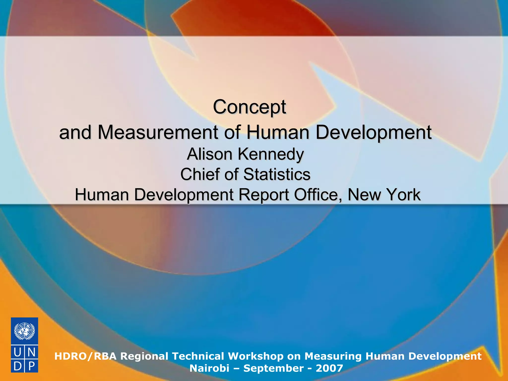 This document discusses the concept and measurement of human development. It begins by outlining the presentation's aims to explain the human development concept and how it differs from other development approaches. It then provides a brief history of the human development concept dating back to Aristotle. Key aspects of the human development approach are explained, including its focus on expanding people's freedoms and choices. The document contrasts the human development approach with concepts like economic growth, human rights, basic needs, the Millennium Development Goals, and PRSPs. It also introduces some of the indices used to measure human development, such as the HDI, HPI, GDI, and GEM.