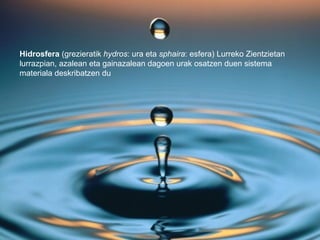 Hidrosfera (grezieratik hydros:ura eta sphaira: esfera) Lurreko Zientzietan