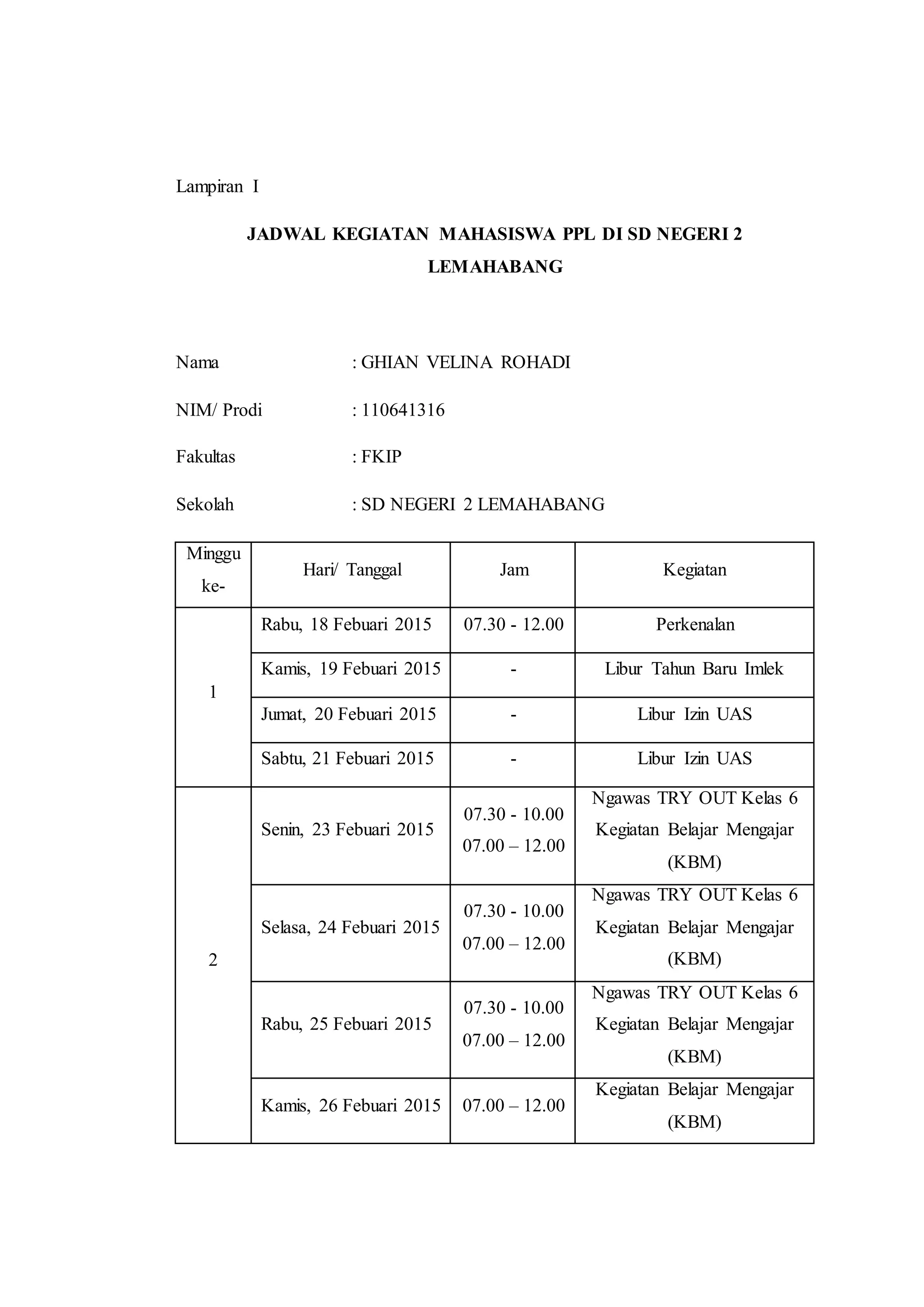 Dokumen ini adalah jadwal kegiatan mahasiswa PPL di SD Negeri 2 Lemahabang untuk periode Februari hingga Maret 2015. Kegiatan termasuk perkenalan, try out, ujian, dan pembelajaran di kelas, dengan detail tanggal dan jam setiap kegiatan. Dosen pembimbing dan kepala sekolah juga disebutkan dalam dokumen ini.