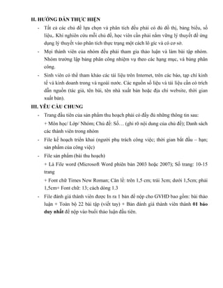 Tài liệu hướng dẫn cách lập kế hoạch và thực hiện bài thu hoạch theo nhóm, yêu cầu mọi thành viên tham gia thảo luận và phân công nhiệm vụ cụ thể. Các sản phẩm cuối cùng phải đáp ứng các tiêu chí kỹ thuật như định dạng, số trang và cách trình bày. Các thông tin cần thiết như môn học, chủ đề và danh sách thành viên phải được trình bày rõ ràng trên trang đầu của sản phẩm.