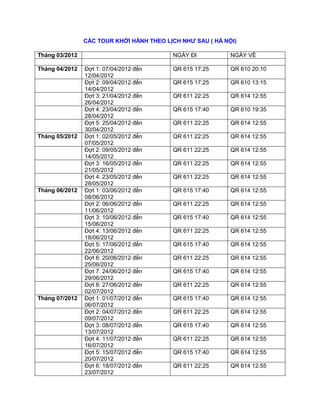Tài liệu cung cấp lịch trình các tour khởi hành từ Hà Nội trong tháng 03 đến tháng 08 năm 2012, với nhiều đợt khác nhau. Mỗi đợt có ngày đi, chuyến bay đến và chuyến bay về cụ thể. Tổng cộng có nhiều đợt tour trong từng tháng, bao gồm các chuyến bay với mã số và giờ cụ thể.