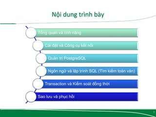 PostgreSQL là hệ quản trị cơ sở dữ liệu quan hệ mã nguồn mở, phát triển từ năm 1986, với phiên bản hiện tại là 13. Nó hỗ trợ đầy đủ các tính năng quan trọng như kiểm soát đồng thời, sao lưu và phục hồi, cũng như hỗ trợ cho nhiều loại dữ liệu như JSON và dữ liệu địa lý. PostgreSQL phù hợp với những ứng dụng cần tính toàn vẹn dữ liệu và khả năng tùy chỉnh cao, mặc dù có thể không phải là lựa chọn tốt nhất cho hiệu suất đọc nhanh.