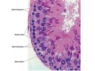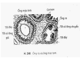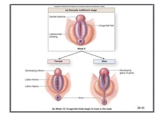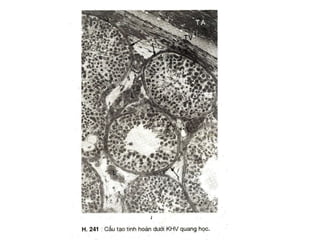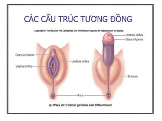 Tài liệu mô tả cấu trúc và chức năng của hệ sinh dục nam và nữ, nhấn mạnh vai trò của các cơ quan trong sự phát triển và sinh sản. Cơ quan sinh dục nữ bao gồm buồng trứng, vòi trứng, tử cung, âm đạo và các bộ phận khác, trong khi cơ quan sinh dục nam chủ yếu tập trung vào tinh hoàn và các ống dẫn tinh. Ngoài ra, tài liệu còn đề cập đến chu kỳ kinh nguyệt và các giai đoạn phát triển của tế bào trứng và tinh trùng.