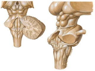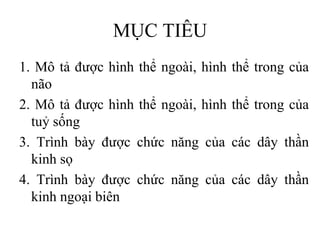 Tài liệu trình bày về giải phẫu và sinh lý của hệ thần kinh, bao gồm cấu trúc não, tủy sống và chức năng của các dây thần kinh sọ và ngoại biên. Nó mô tả hình thể bên ngoài và bên trong của não và tủy sống, cũng như các loại mô thần kinh và chức năng phản xạ của tủy sống. Đặc biệt, tài liệu nhấn mạnh vai trò của các vùng não trong điều khiển vận động, cảm giác và các chức năng cơ bản khác của cơ thể.
