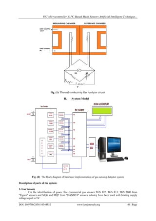This document describes a PIC microcontroller and PC-based system using multiple gas sensors and artificial intelligence techniques for gas identification. Five commercial gas sensors are used to detect methane, carbon monoxide, and LPG at different concentrations and temperatures. The microcontroller collects analog voltage output from the sensors. Artificial neural networks are trained on the sensor data to identify gases based on patterns in responses to varying parameters like concentration, temperature, and load resistance. Experimental results show the sensors have different sensitivities to different gases and temperatures. The neural network approach can accurately predict gas concentrations online based on the sensor behavior patterns extracted during experiments. This system improves gas detection sensitivity and selectivity with high accuracy.