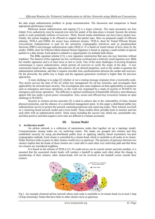 This document proposes a protocol for trilateral authentication in ad-hoc networks using multicast conventions. It introduces a central authority that manages key authentication and certification to increase security and reliability. Nodes are grouped into clusters, each with a cluster head. For similar clusters, authentication uses time asymmetry based on TESLA. For cross-cluster traffic, it uses secret information asymmetry where the source sends packets to cluster heads, which relay to members. Evaluation shows the central authority uses less memory than previous methods and the protocol has higher efficiency.