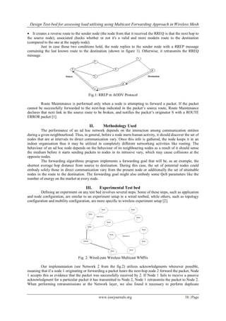 This document describes a study that developed a test bed to evaluate load and battery lifetime in wireless mesh networks using a multicast forwarding approach. The test bed used the AODV routing protocol and implemented layer 3 acknowledgments and retransmissions. Results found that the network supported data delivery with acknowledgments even under full load. Battery lifetime across mesh nodes was measured between 19-100% and load was minimum compared to previous work, demonstrating the effectiveness of the multicast forwarding approach. Future work could enhance security and implement cross-layer support between network and MAC layers.