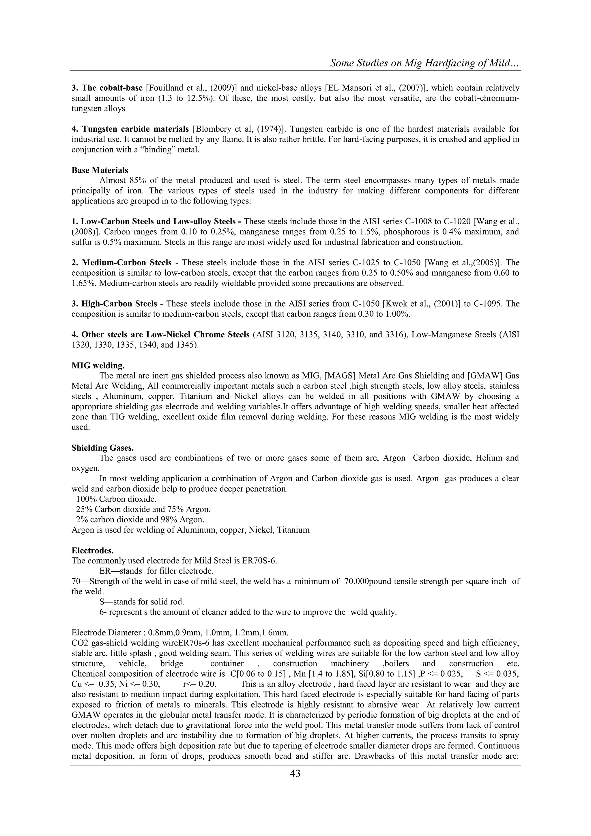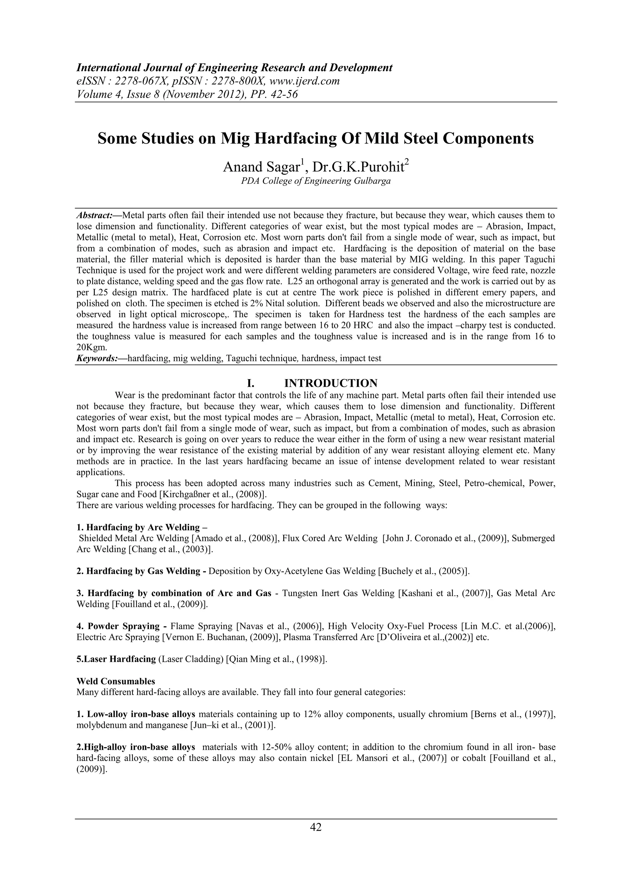 This document summarizes research on using the Taguchi method to optimize metal inert gas (MIG) hardfacing welding parameters. The Taguchi method uses orthogonal arrays to minimize the number of experimental runs needed. In the study, different welding parameters including voltage, wire feed rate, nozzle-to-plate distance, welding speed, and gas flow rate are considered as control factors. An L25 orthogonal array is used to conduct the experiments according to the design matrix. Hardness and impact toughness tests are performed on the hardfaced samples, showing improvements in the properties. Grey relational analysis and desirability functions are also discussed as part of the Taguchi method optimization approach.