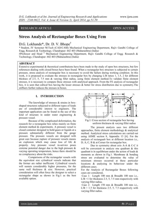 The document presents a study on the stress analysis of rectangular box structures using the finite element method (FEM), focusing on various length-to-breadth ratios and thicknesses. It demonstrates the importance of analyzing these structures under internal pressure to prevent failures, comparing FEM results with analytical calculations. The findings indicate that cubical boxes show better stress distribution and that the addition of stiffeners reduces stress concentrations.