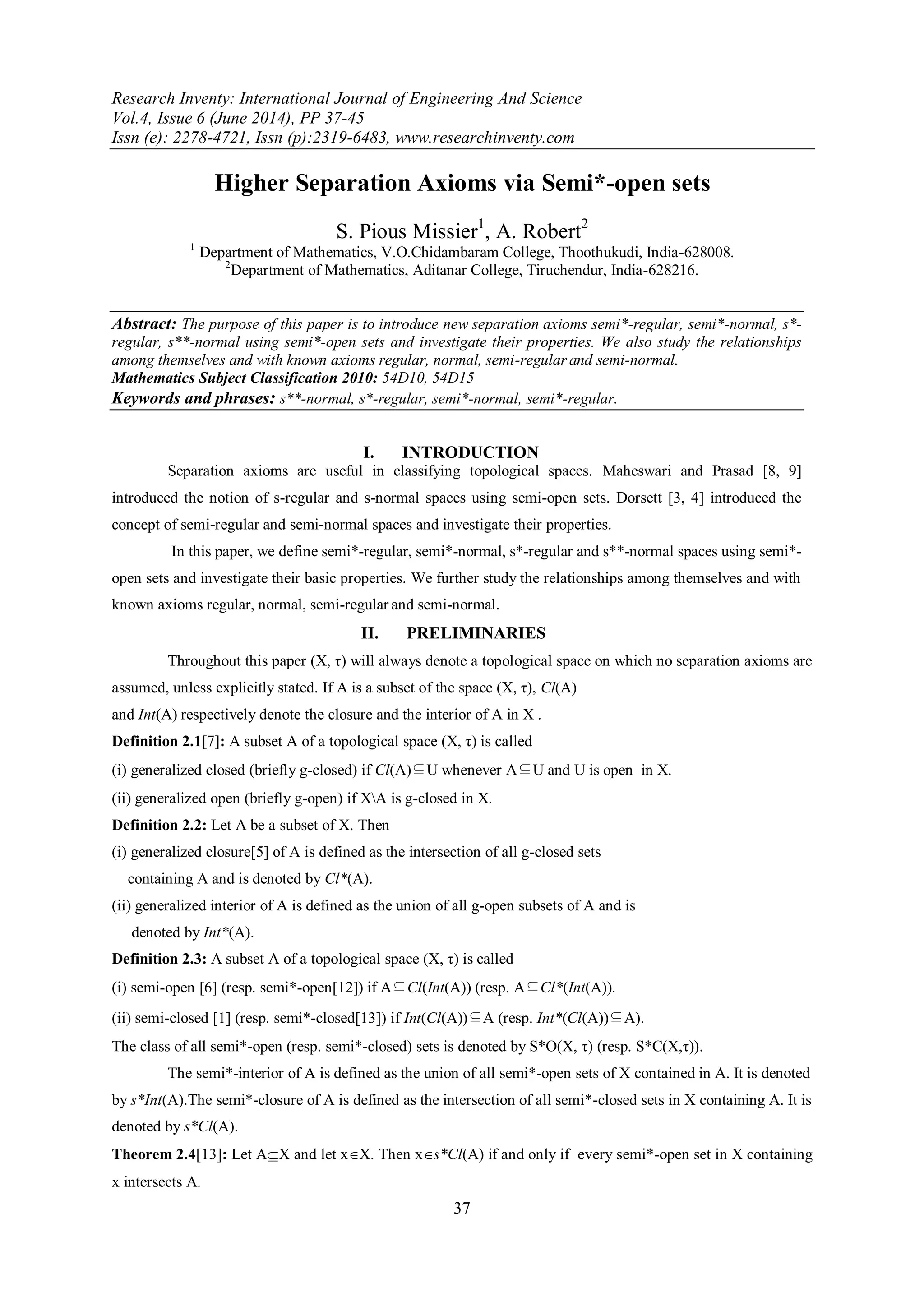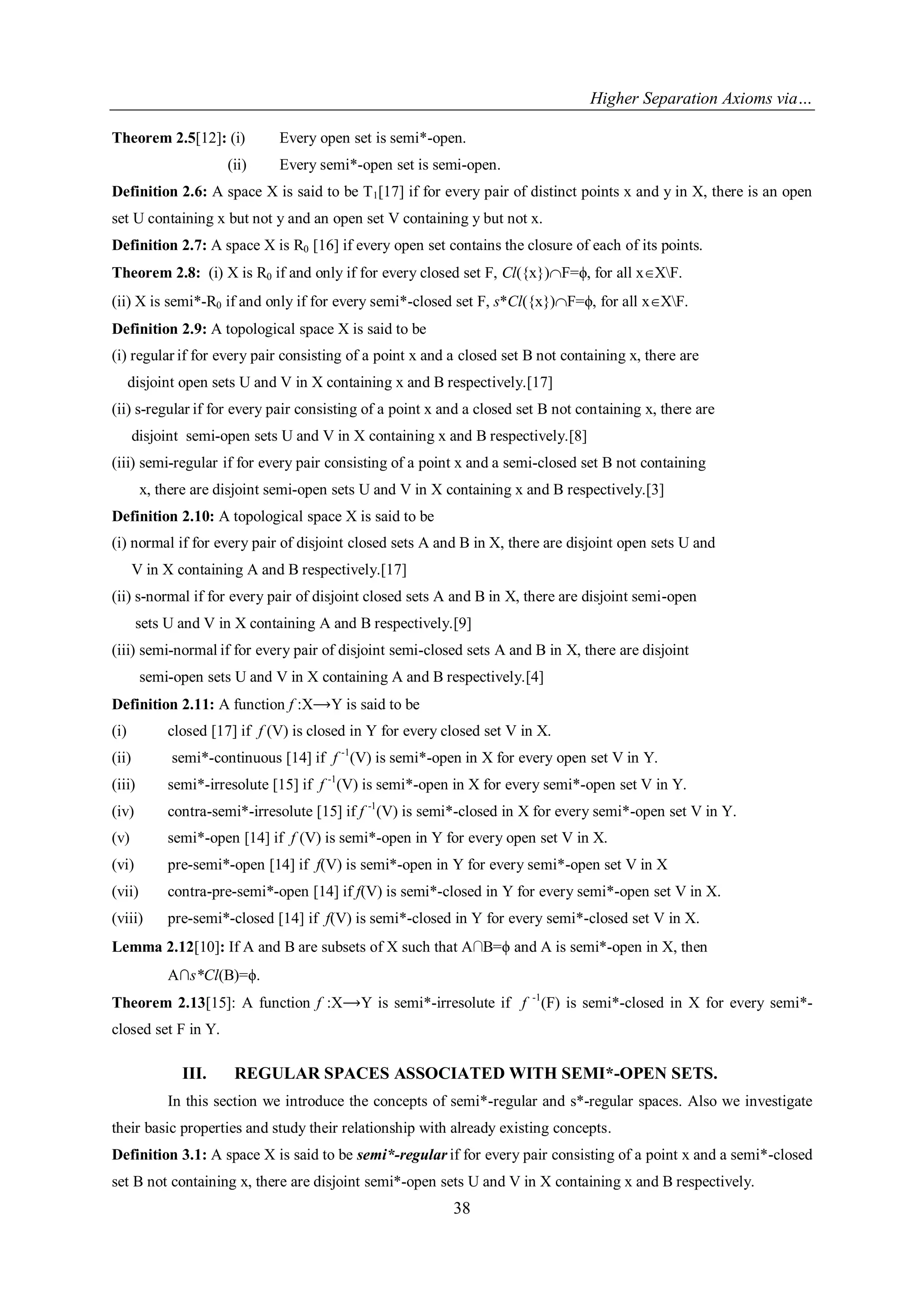 This paper introduces new separation axioms—semi*-regular, semi*-normal, s*-regular, and s**-normal—using semi*-open sets, and investigates their properties and relationships to existing axioms. It defines concepts like generalized closed and open sets, as well as semi*-closed and semi*-open sets, laying a foundation for higher separation axioms in topology. The results illustrate the classification and analysis of topological spaces based on these innovative principles.