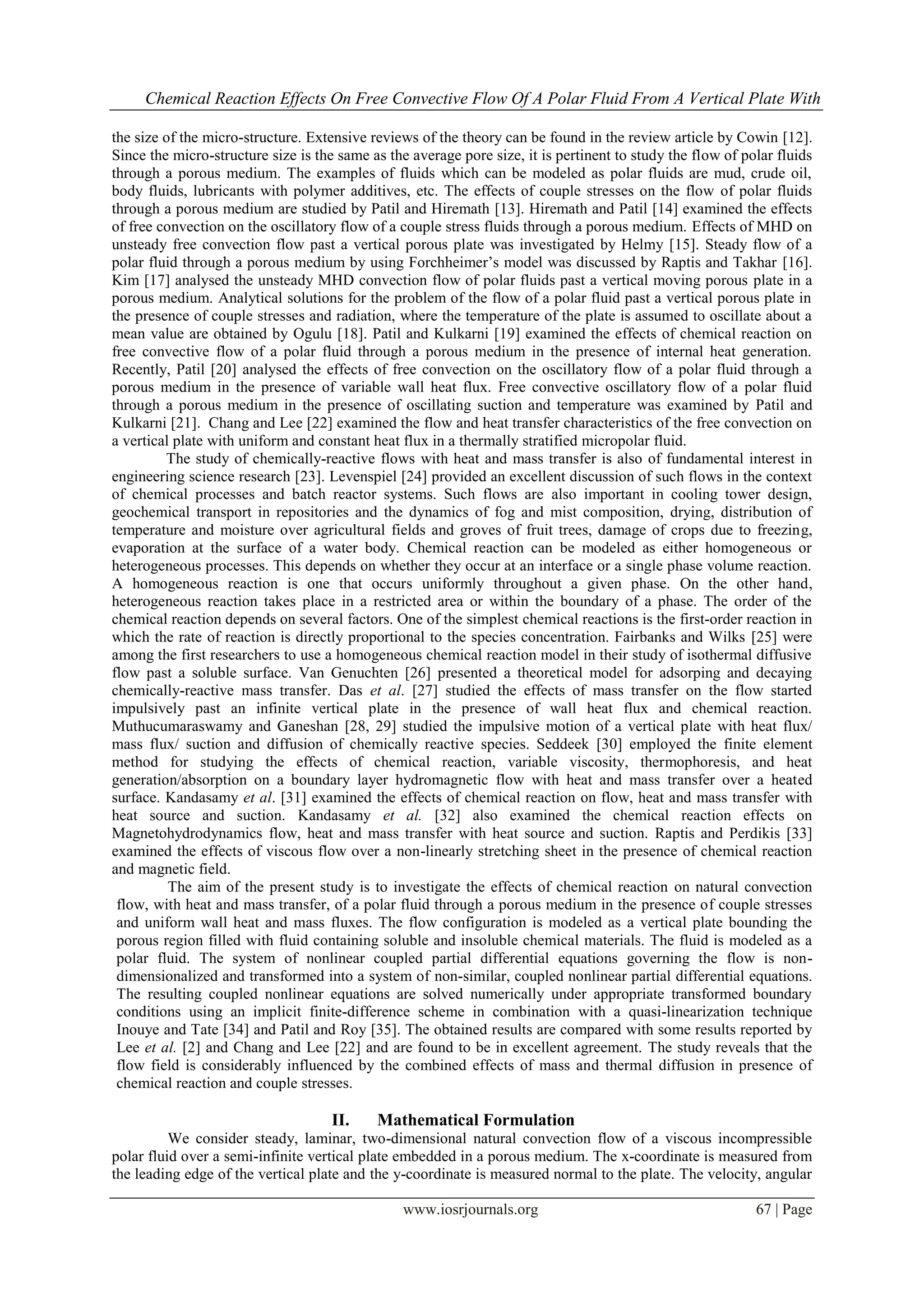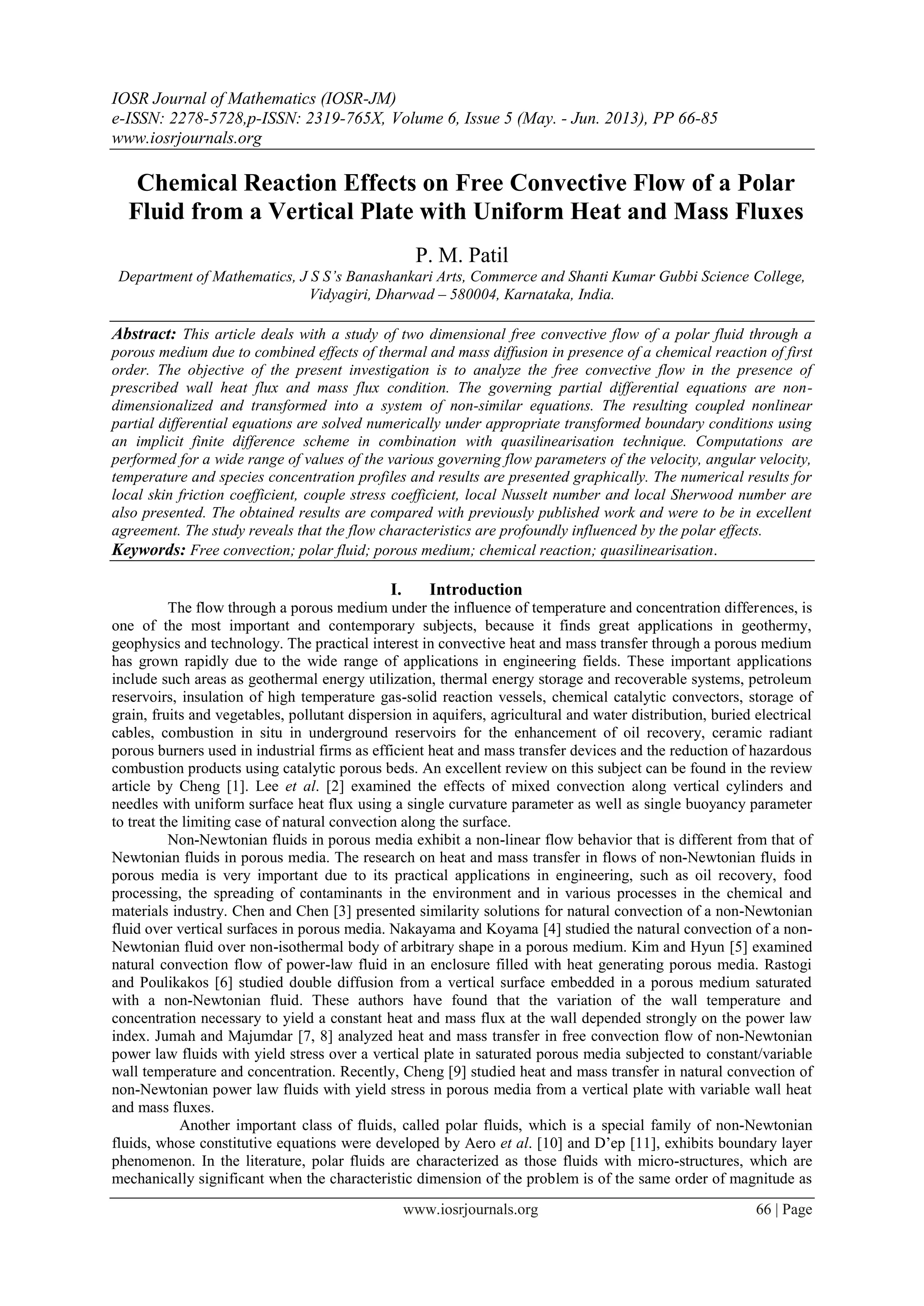 This study investigates the two-dimensional free convective flow of a polar fluid through a porous medium affected by thermal and mass diffusion in the presence of a first-order chemical reaction. Governing equations are transformed into a system of non-similar equations and solved numerically, revealing significant influence of polar effects on flow characteristics. The results align well with previously published work, showcasing the effects of mass and thermal diffusion along with couple stresses on the flow field.