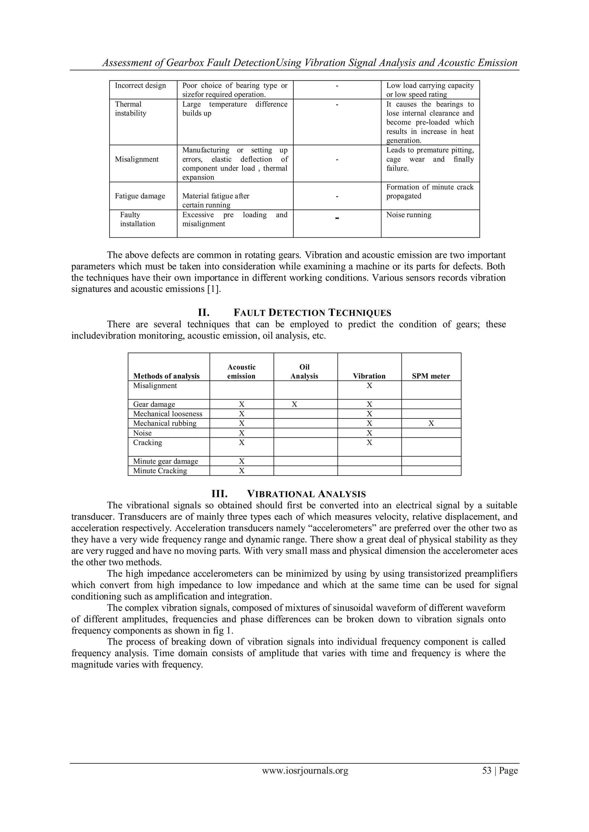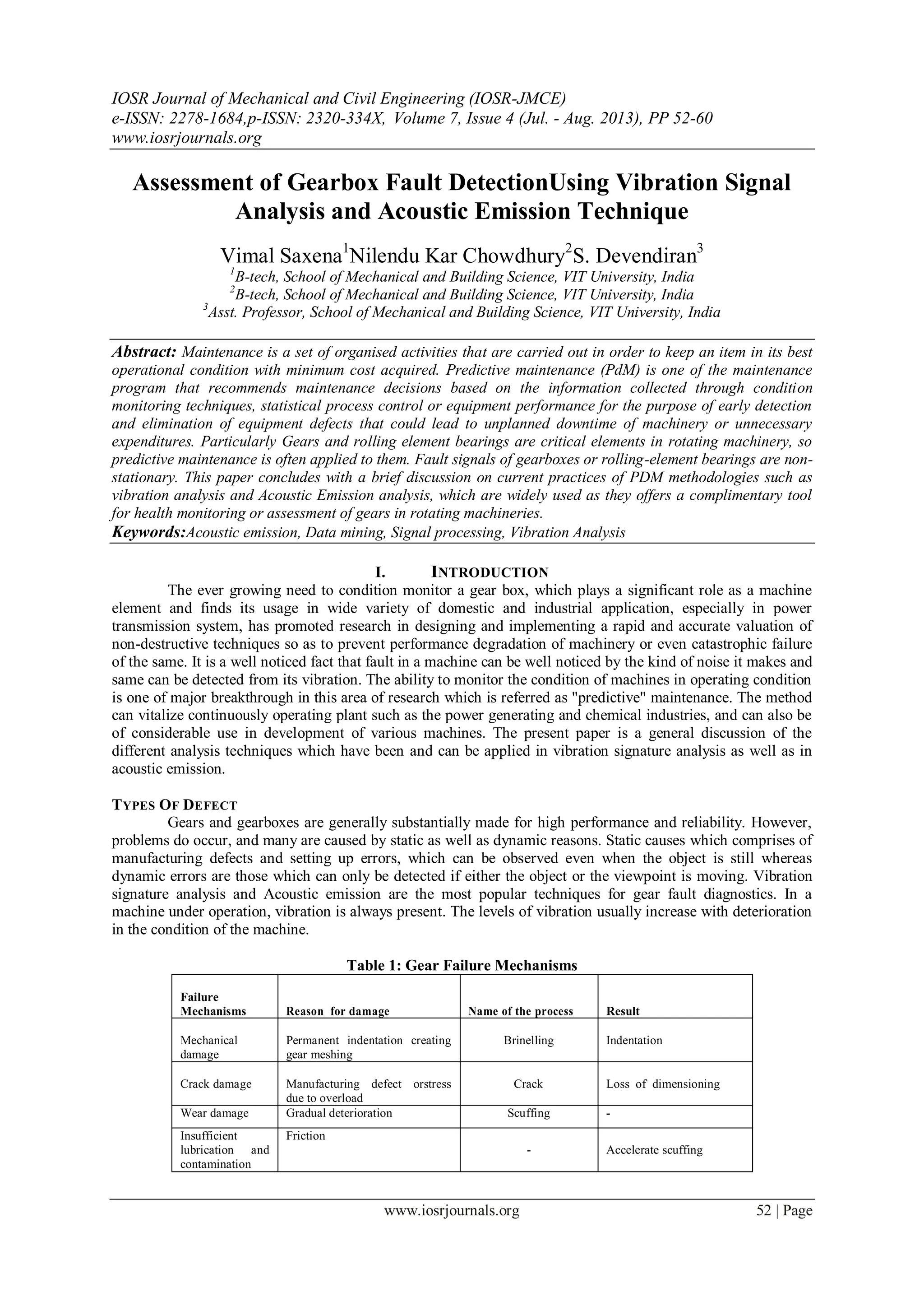 The paper discusses predictive maintenance (PDM) methodologies for gearbox fault detection using vibration signal analysis and acoustic emission techniques. It emphasizes the significance of monitoring gear condition to prevent unplanned downtime and catastrophic machinery failures, detailing various fault detection techniques and their importance in diagnosing gear issues. The study highlights the use of vibrational signatures and acoustic emissions as complementary approaches for effective health monitoring of gears in rotating machinery.