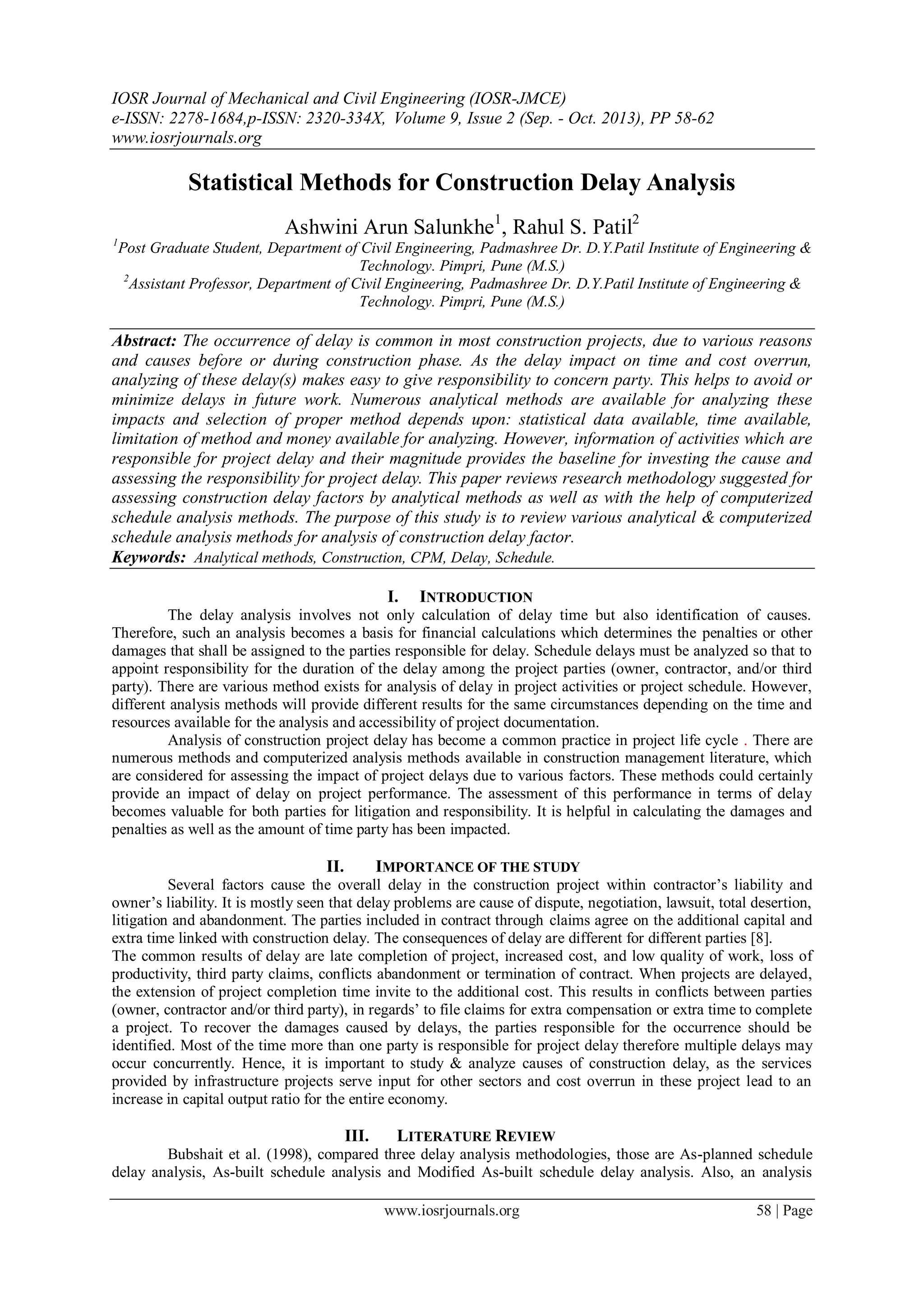 The paper reviews various statistical and computerized methods for analyzing delays in construction projects, highlighting the significance of understanding the causes and impacts of these delays to assign responsibility and mitigate future issues. It discusses the necessity of selecting appropriate analysis techniques based on the available data and resources, as well as the role of such analyses in determining financial impacts, penalties, and project performance. The study emphasizes that multiple methodologies exist, each providing unique insights, making it essential to choose the right method for accurate delay assessment.