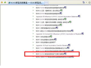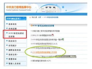 點進去後會看到中央流行疫情指揮中心的網頁。在左邊,H1N1新型流感疫苗接種,點進去後會看到一串有關疫苗接種的項目。請點進第六項,H1N1新型流感疫苗接種工作手冊。