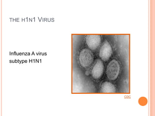 The H1N1 virus, also known as swine flu, originated in Mexico and spread to the United States, causing outbreaks. It can affect people of all age groups and causes mild to severe symptoms, ranging from fever and cough to body aches and vomiting. Schools have been impacted by closing classes and cancelling activities when outbreaks occur due to student and staff absences. Public health officials recommend measures like staying home when sick, hand washing, cleaning surfaces, and temporary school closures to limit disruption and spread of the virus. The H1N1 virus remains a serious public health issue.
