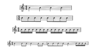This document provides an overview of music notation concepts including rhythm, meter, tempo, and notation of rhythms. The key points covered are: