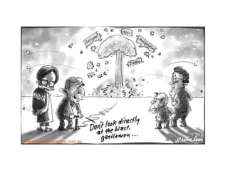 The document discusses the nuclear arms race between the United States and Soviet Union from the late 1940s through the 1980s. It describes how both nations engaged in an escalating arms buildup, developing new weapons like ICBMs, SLBMs, and MIRVs. It also discusses key events and agreements that shaped the arms race, such as the Soviet testing of nuclear weapons in 1949, the Cuban Missile Crisis in 1962, and arms limitation treaties like SALT I and SALT II. Throughout this period, both superpowers pursued policies of deterrence based on the threat of mutually assured destruction.