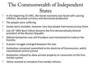 The document summarizes the collapse of the Soviet Union and the legacy it left behind. It discusses the power struggle that emerged between Gorbachev and Yeltsin in 1991. It describes the failed coup attempt in August 1991 and the dissolution of the USSR by the end of that year. The summary also outlines some of the major issues that arose in the aftermath, including control of the former Soviet Union's nuclear arsenal, ethnic tensions between groups, and conflicts like the war in Chechnya. Political changes in Russia in the 1990s under Yeltsin are also summarized.
