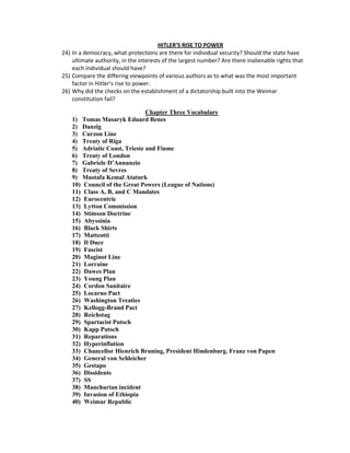 The document provides an overview and questions about the interwar period in Europe following World War 1. It discusses the instability of successor states after the war and the establishment of the League of Nations to promote cooperation. However, the League ultimately failed due to a lack of military enforcement and the ability of states like Japan and Italy to act aggressively without consequence. It also examines the rise of fascism in Italy under Mussolini and the economic and political instability across Europe in the aftermath of World War 1.