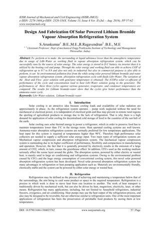 This document describes the design and fabrication of a solar powered lithium bromide vapor absorption refrigeration system. It uses lithium bromide and water as the working fluids, with solar energy powering the generator to separate the water vapor from the lithium bromide solution. The water vapor then condenses and evaporates to provide cooling, while the strong lithium bromide solution absorbs the water vapor back into a weak solution to complete the cycle. The document provides details on the system components, operating principles, and achievable COP between 0.7-0.8 using this environmentally friendly solar powered system.