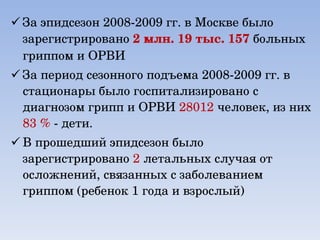 Документ содержит информацию о гриппе A/H1N1 и его эпидемиологии, описывая случаи заболевания в Москве за эпидсезон 2008-2009 гг. и характеристики вируса, включая механизм передачи и клинические проявления. Также представлены схемы лечения и профилактики, а также перечень рекомендованных противогриппозных препаратов и вакцин.