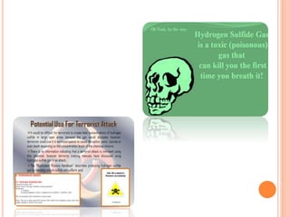 The document presents an overview of hydrogen sulfide (H2S), a highly toxic gas produced from decomposing organic materials and sulfur compounds. It details its properties, sources, health hazards, and the importance of detection and protection measures in environments where H2S may be present. Several historical accidents linked to H2S exposure underscore the critical need for safety protocols in mining operations.