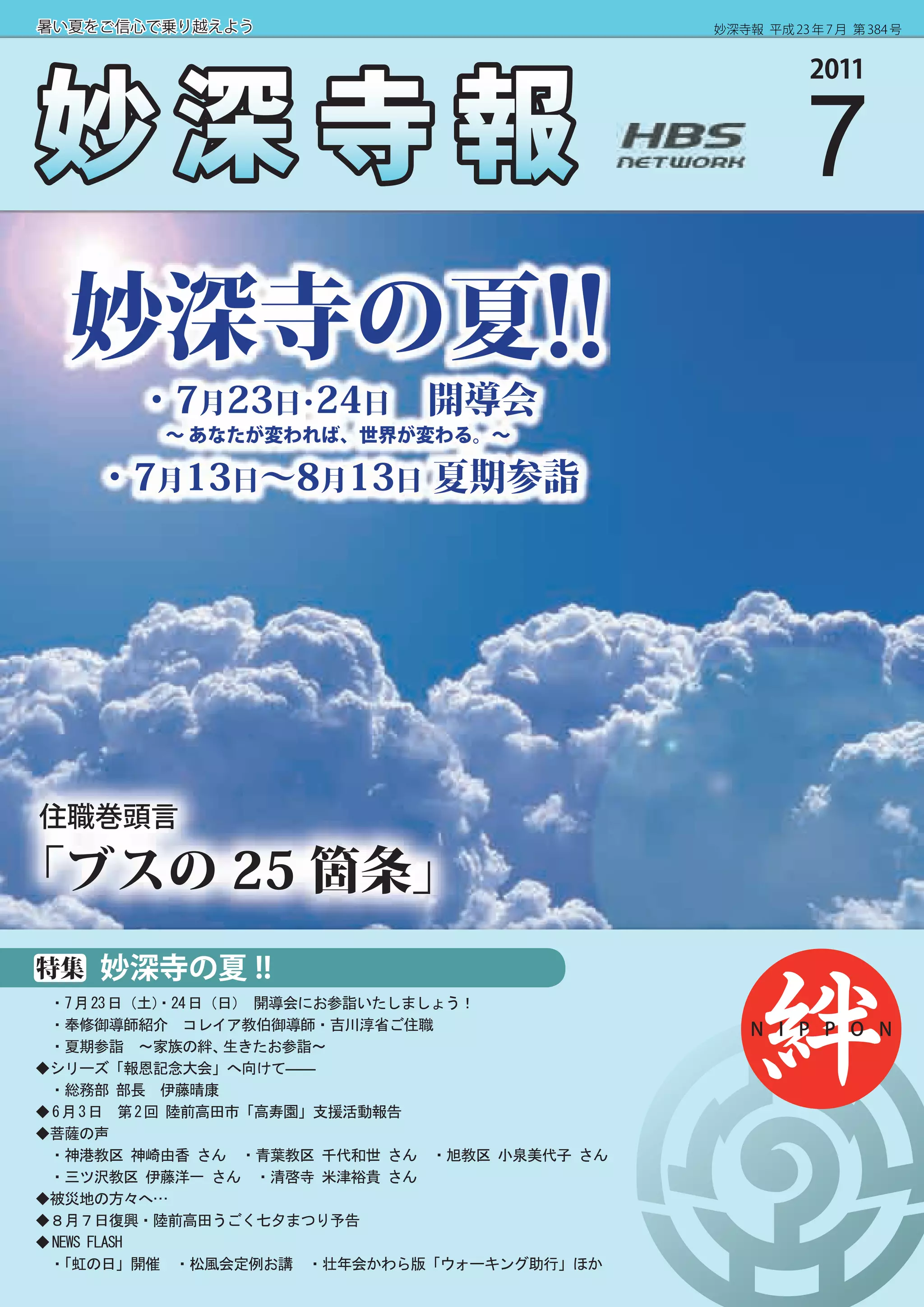 開導会にお参詣いたしましょう! ・奉修御導師紹介 コレイア教伯御導師・吉川淳省ご住職 ・夏期参詣 ~家族の絆、 生きたお参詣~ ◆シリーズ「報恩記念大会」へ向けて―― ・総務部 部長 伊藤晴康 ◆6月3日 第2回 陸前高田市「高寿園」支援活動報告 ◆菩薩の声 ・神港教区 神崎由香 さん ・青葉教区 千代和世 さん ・旭教区 小泉美代子 さん ・三ツ沢教区 伊藤洋一 さん ・清啓寺 米津裕貴 さん ◆被災地の方々へ… ◆8月7日復興・陸前高田うごく七夕まつり予告 ◆NEWS FLASH ・「虹の日」開催 ・松風会定例お講 ・壮年会かわら版「ウォーキング助行」ほか