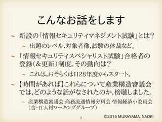 Similar to 「情報処理技術者試験。H28年度春期からの“情報セキュリティマネジメント試験”と,SC試験合格者“登録制度”の動向」