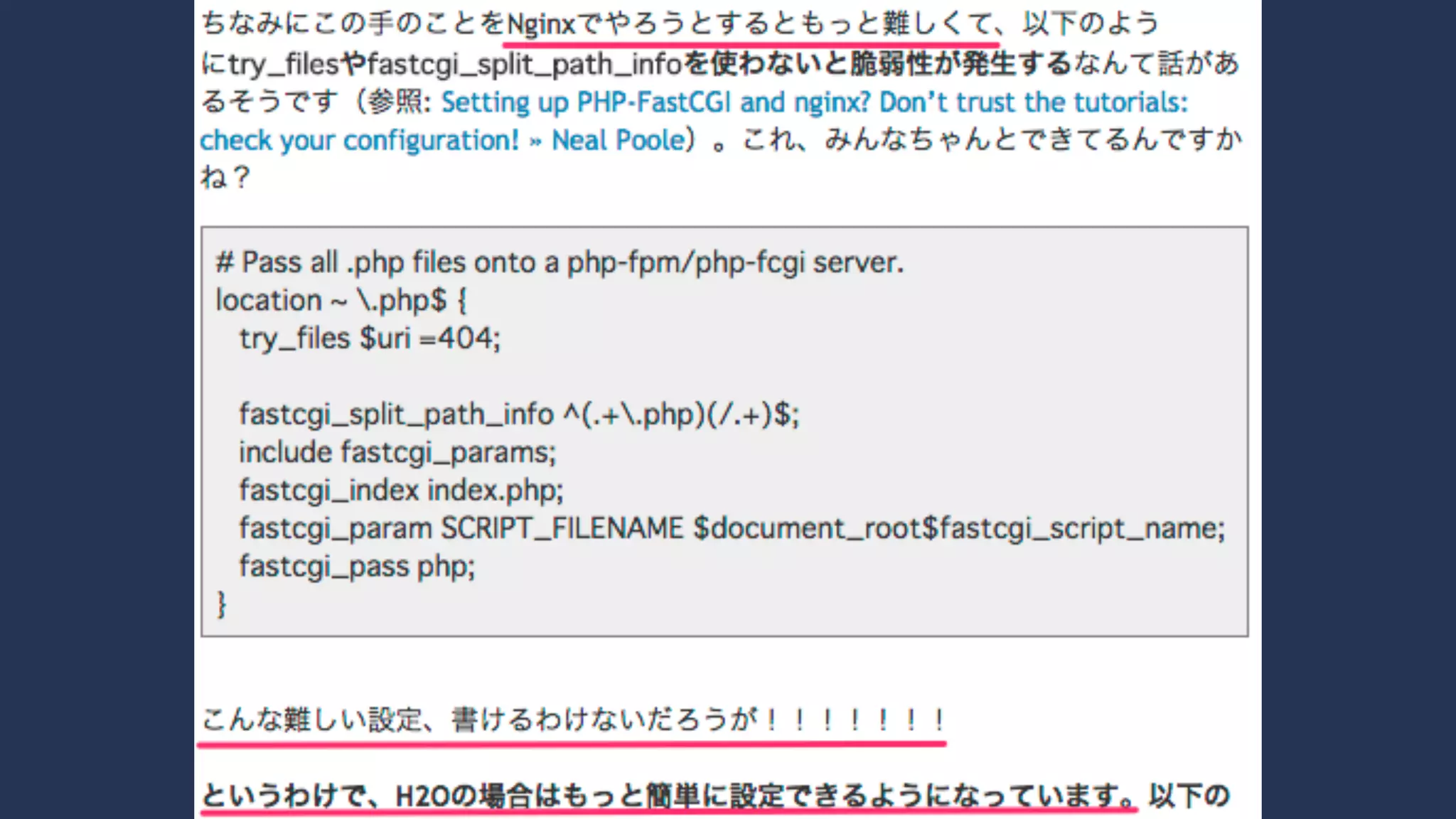 /index.php?$args; • 一例です、nginx.confなどに書く • ?の後にイチイチ$argsとつける • これだけだと簡単にみえるが、実際には闇深い(時間ないので 説明は省略)