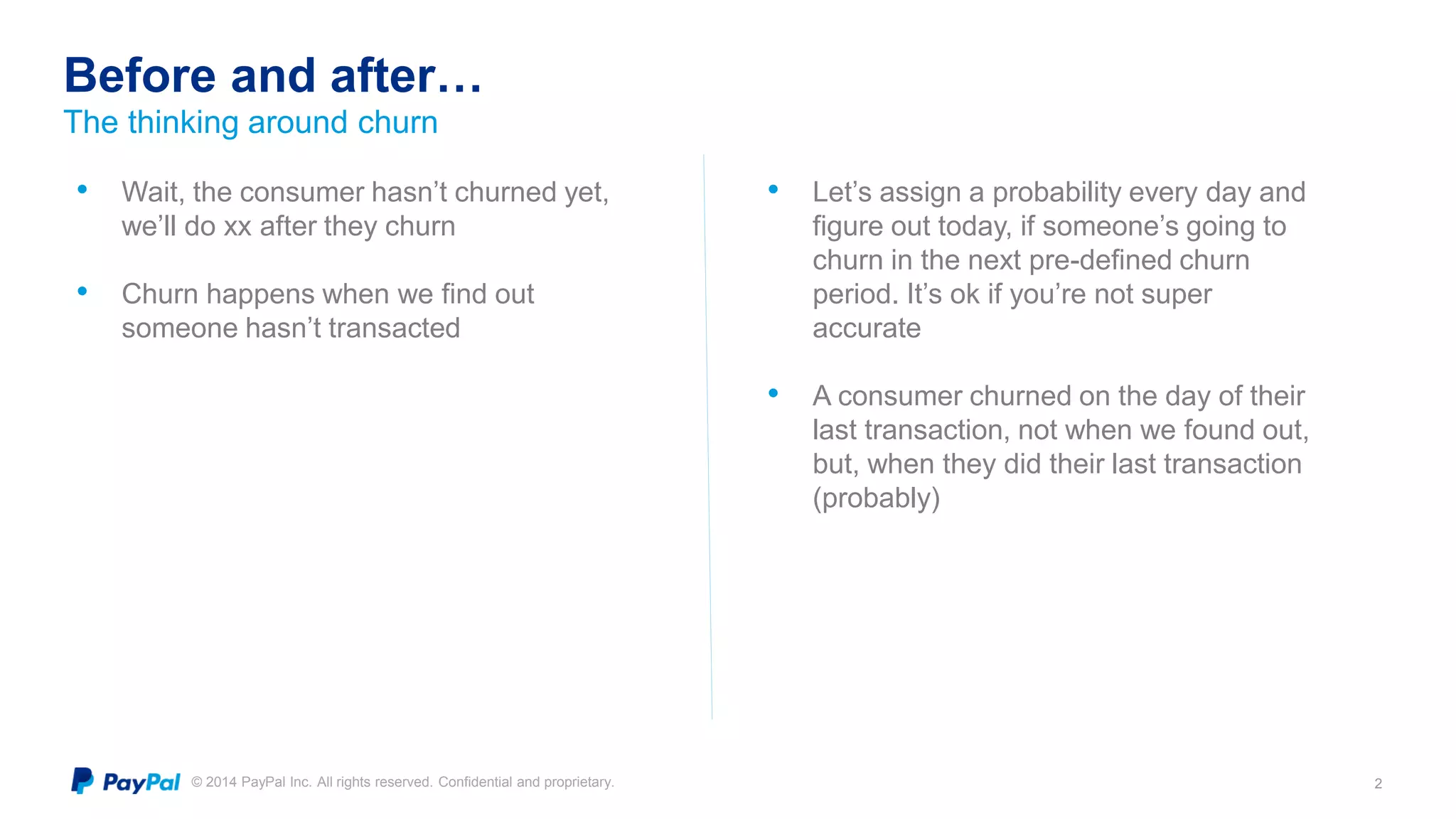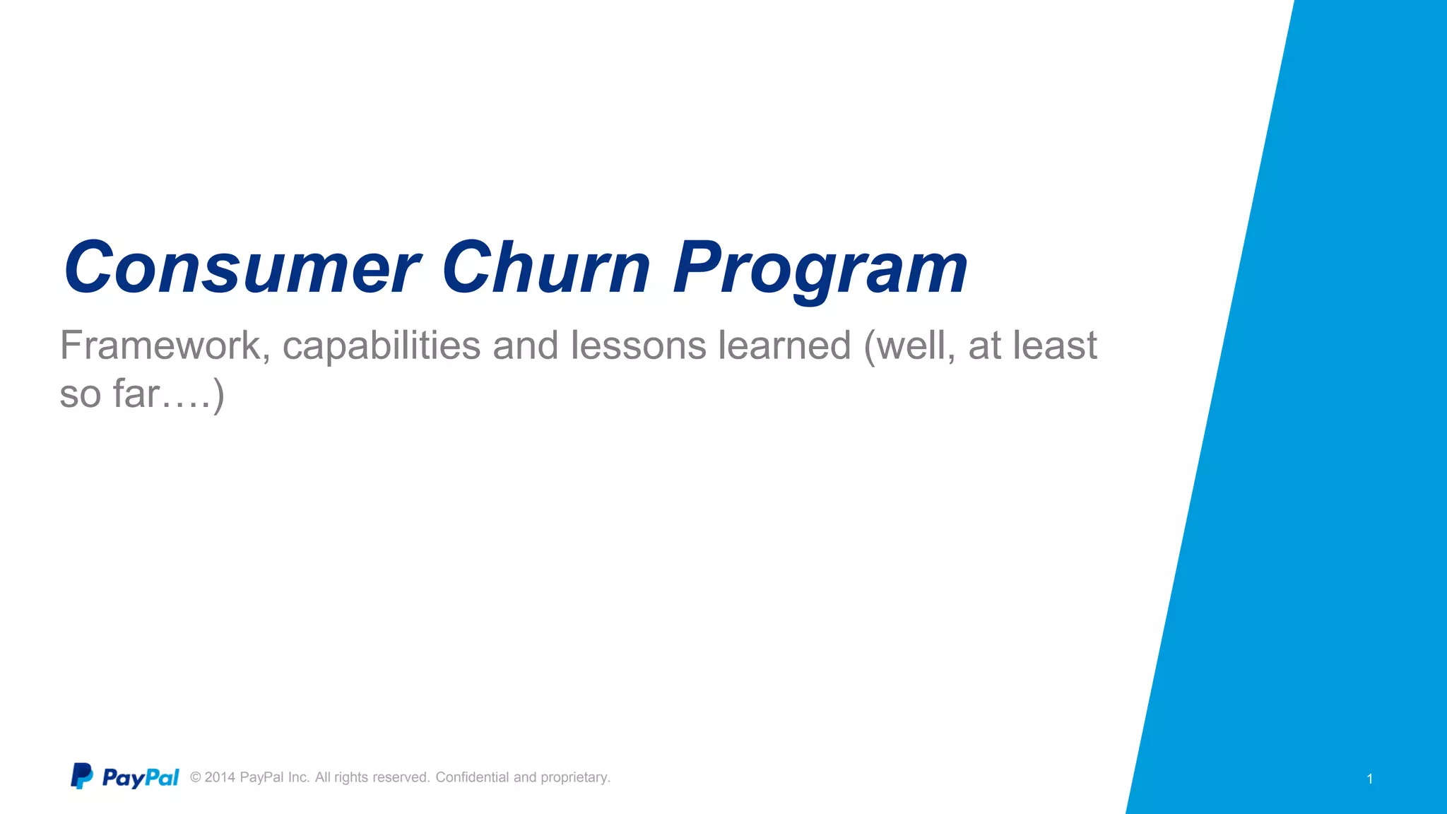 The document discusses PayPal's efforts to develop a consumer churn prediction model. It describes the evolution of their thinking around churn, provides examples of model performance metrics on different datasets and hardware configurations, and discusses lessons learned around feature engineering, model optimization, and productionizing predictive models. The goal is to develop a model that can be run daily to better forecast consumer churn.