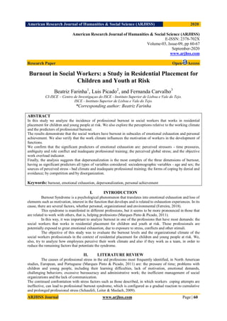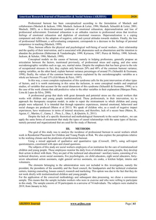 This study analyzed burnout levels in social workers working in residential placements for at-risk children and youth. It found that the social workers experienced burnout in the dimensions of emotional exhaustion and personal achievement. The work climate was found to influence workers' motivation. Significant predictors of emotional exhaustion included perceived stressors like time pressures and role conflicts, as well as inadequate professional training. Depersonalization, the most complex burnout dimension, had various significant predictors including age, sex, perceived stress sources, and coping styles. The results suggest attention should be paid to reducing stressors and improving training to help prevent burnout in these social workers.