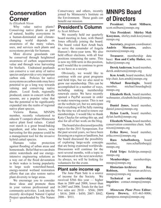The document summarizes a talk given at a Minnesota Native Plant Society meeting about creating a butterfly garden using native plants. It notes that native plants provide nectar and host plants for butterflies throughout their lifecycle. The summary encourages selecting plants suited to the site conditions and providing shelter from wind, and suggests having flowers blooming from spring through fall in masses with plants grouped closely together. It also briefly outlines upcoming society events and programs.