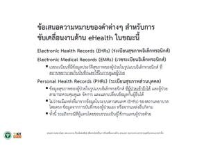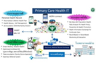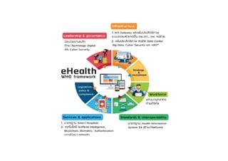 และ 4 Excellence กระทรวงสาธารณสุข ยุทธศาสตร์ชาติ 20 ปี (พ.ศ. 2560 – 2579) ความมั่นคง การสร้าง ความสามารถ ในการแข่งขัน การพัฒนา และเสริมสร้าง ศักยภาพคน การสร้างโอกาสความ เสมอภาคและเท่าเทียม กันทางสังคม การสร้างการเติบโตบน คุณภาพชีวิตที่เป็นมิตร กับสิ่งแวดล้อม การปรับสมดุลและ พัฒนาระบบการ บริหารจัดการภาครัฐ แผน DE : แผนพัฒนาดิจิทัลเพื่อเศรษฐกิจและสังคม พัฒนาโครงสร้าง พื้นฐานดิจิทัล ประสิทธิภาพสูงให้ ครอบคลุมทั่วประเทศ ขับเคลื่อน เศรษฐกิจด้วย เทคโนโลยี ดิจิทัล สร้างสังคม คุณภาพที่ทั่วถึง เท่าเทียมด้วย เทคโนโลยีดิจิทัล ปรับเปลี่ยน ภาครัฐสู่การ เป็นรัฐบาล ดิจิทัล พัฒนากําลังคนให้ พร้อมเข้าสู่ยุค เศรษฐกิจและสังคม ดิจิทัล สร้างความ เชื่อมั่นในการใช้ เทคโนโลยีดิจิทัล P&P Excellence Service Excellence People Excellence Governance Excellence 4 Excellence Strategies กระทรวงสาธารณสุข ส่งเสริมสุขภาพและ ป้องกันโรคเป็นเลิศ บริการเป็นเลิศ บุคลากรเป็นเลิศ บริหารเป็นเลิศ ด้วยธรรมาภิบาล ① จัดตั้งองค์กร กลางความร่วมมือ การบริหารจัดการ eHealth ② พัฒนาและปรับปรุง สถาปัตยกรรมองค์กร และโครงสร้างพื้นฐาน เพื่อสนับสนุนการ ให้บริการ eHealth แก่ ประชาชน ③สร้างมาตรฐานของ ระบบข้อมูลสุขภาพ การบูรณาการข้อมูล สารสนเทศและการ เชื่อมโยงแลกเปลี่ยน ข้อมูลที่มีประสิทธิภาพ ④ ขับเคลื่อนและพัฒนา นวัตกรรม ระบบบริการและ โปรแกรมประยุกต์ ด้าน eHealth ฯ ⑤ ผลักดันการใช้ กฎหมาย ระเบียบ วิธีปฏิบัติฯ ⑥ พัฒนาทุนมนุษย์ ด้าน eHealth ฯ