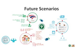 มาปรับใช้ • แนวคิดที่สร้างสรรค์กว่าเดิม เช่น Customer Centric, Human Center Design – ลูกค้าของเราคือใคร ? / ทุกคนมีความแตกต่างกัน / นําเสนอข้อมูลโดนใจด้วยระบบแนะนําอัจฉริยะ / สร้าง ประสบการณ์ที่ดีให้กับลูกค้าในทุกๆช่องทาง / วางแผน ติดตามและรับมือกับความรู้สึกของลูกค้าให้ดียิ่งขึ้น • ประคับประคอง : ก้าวเดินไปพร้อมกัน แบ่งปันและส่งเสริม – Partner กับ โรงพยาบาล นักวิชาการ กรม • Educate / Engage ผู้ป่วย • รากฐานต้องมั่นคง – การผลักดันโยบาย ภาครัฐ / นโยบายชัดเจน ผู้บริหารสนับสนุนจริงจัง / ยุทธศาสตร์ eHealth – โครงสร้างพื้นฐานเทคโนโลยีดิจิทัล พร้อมใช้และมีคุณภาพ – กฎระเบียบรองรับ คุ้มครองทั้งผู้ให้และผู้รับบริการ • ใช้เทคโนโลยีเหมาะสม – รู้เท่าทันเทคโนโลยี : ไม่ต้องล้ําหน้า แต่ ต้องไม่ล้าหลัง